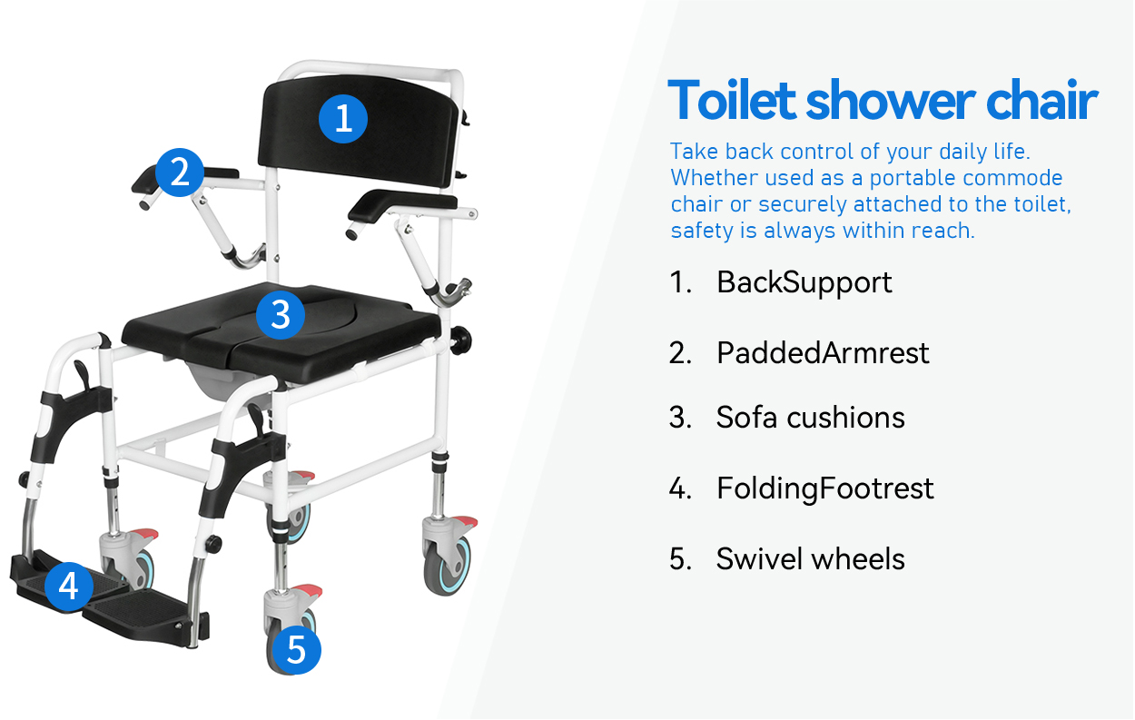The pedal of this toilet shower chair has a folding and retracting function, which does not affect sitting or standing up. It is particularly suitable for people with limited mobility. Make standing up and sitting down smoother and less strenuous.