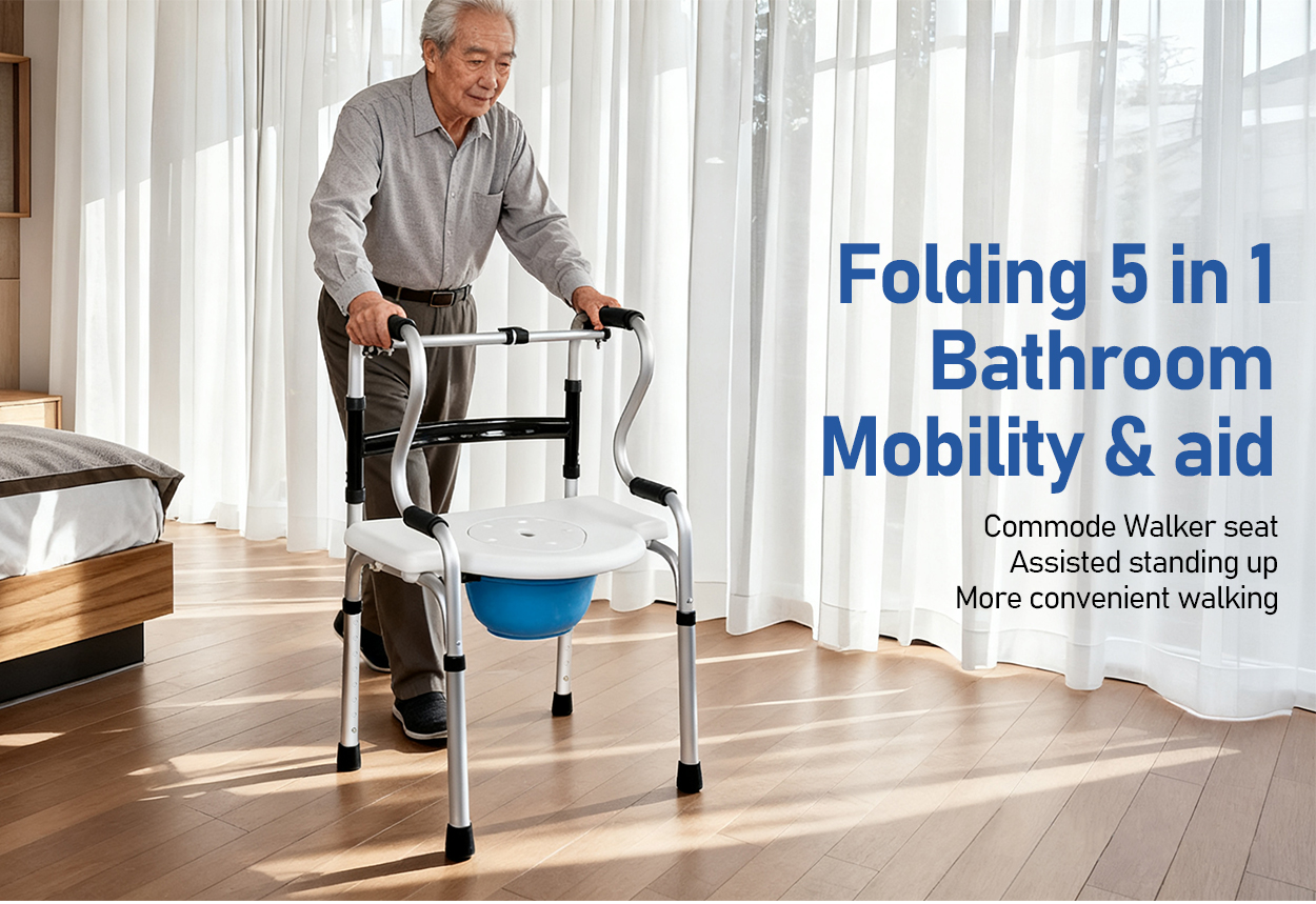 Folding 5-in-1 Bathroom Mobility & aid Commode Walker seat, Height Adjustable Daily Living aid :